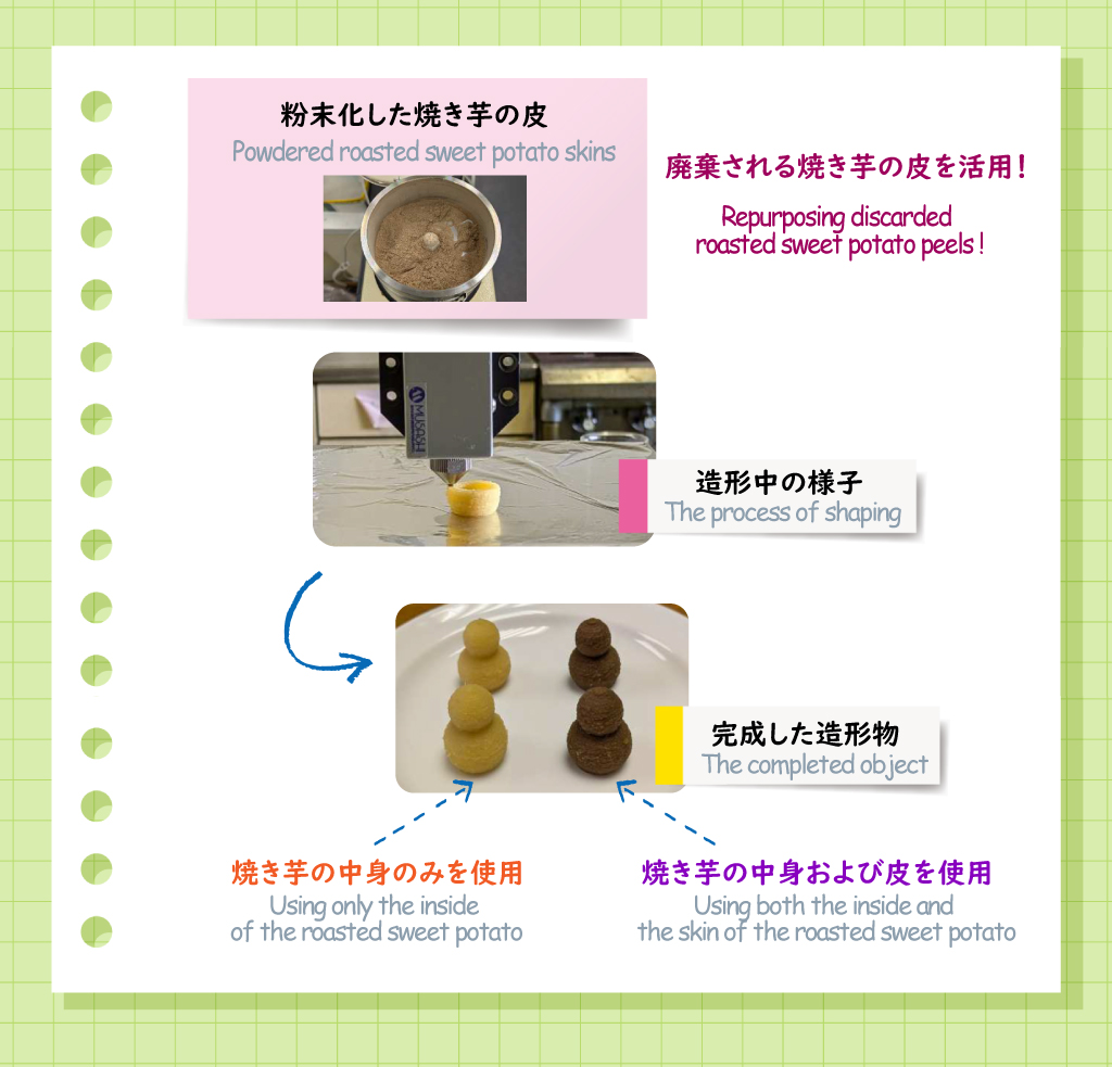 พยายามจัดการกับการหล่อขึ้นรูป 3D ที่ใช้หนังสัตว์ของมันฝรั่งอบ เปลือกของมันฝรั่งอบมักจะถูกหลบเลี่ยงด้วยเหตุผล ที่ว่า "หัวแข็ง" " ขม" และถูกทิ้ง และมีส่วนทำให้การสูญเสียอาหารโดยปกติ ดังนั้นทำให้เปลือกของมันฝรั่งอบแห้งกับเตาอบไมโครเวฟ และทำให้เป็นผงกับเครื่องบด เติมผงนั้นในวัสดุหลาย% และทำการหล่อขึ้นรูป 3D ดังนั้นทำให้เป็นจริงผลงานลื่น ไม่มีจุดด้อย พอใช้ส่วนในของมันเทศเท่านั้น