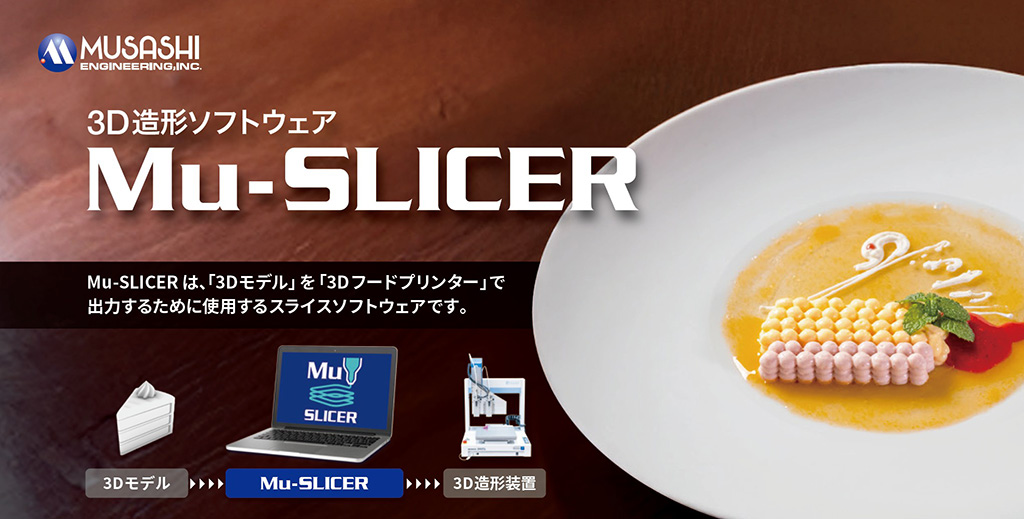 แผ่นตัดบางๆ ที่บริษัทของเราพัฒนาแบบเป็นเอกลักษณ์นุ่ม และ Mu-SLICER เกิดการควบแน่นในโนฮาวเกี่ยวกับการจับสลากที่บริษัทของเราเพาะปลูกที่วงการผู้จ่ายมา และกลายเป็นซอฟต์แวร์ที่ตันฟังก์ชันที่จำเป็นสำหรับเครื่องพิมพ์ 3D อาหาร เพื่อครองวัสดุของเหลว