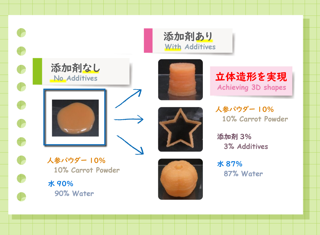 เกี่ยวกับกระบวนการที่เป็นรูปธรรมนั้น แนะนำอย่างละเอียดอีกสักหน่อย ว่าขึ้นราวัตถุดิบปรุงอาหารที่มีรูปร่างผง (ผง) ด้วยเครื่องพิมพ์ 3D อาหารอย่างไรสภาพของวัสดุแบบเหลวขึ้นตัวอย่างเช่น กรณีที่เพิ่มน้ำ 90% สำหรับผงแครอท ในขณะเดียวกัน พอปริมาณของน้ำน้อยเกินไป all dried out และไม่มีการรวมตัวกันขึ้น นอกจากนั้นจำเป็นต้องมีการลองผิดลองถูกจำนวนมาก ในการเจอการแจกจ่ายที่เหมาะสมสำหรับการหล่อขึ้นรูป 3D เพราะผลหลากหลายไปตามคุณสมบัติของ powders เช่น water absorptivity ของ powders เป็นต้นด้วย