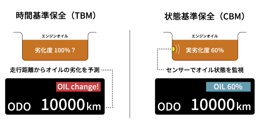 ทำการแลกเปลี่ยนของน้ำมันเครื่องอย่างแข็งขันโดยตัดสินจากระยะทางที่รถแล่นและระยะเวลาของรถยนต์นั้นเป็นเรื่องธรรมดาตัวอย่างเช่น พอเลือกรถยนต์เป็นตัวอย่าง เพื่อแตกต่าง เป้าหมายคนขับรถคำนวณช่วงเวลาที่การแลกเปลี่ยนจำเป็นอย่างถูกต้องนั้นยากโดยเงื่อนไขการวิ่งของรถยนต์ด้วย ไม่เพียงแต่ระยะทางที่รถแล่นง่ายเท่านั้นยานพาหนะที่ตัดสินความถี่ของจำนวนรอบของเครื่องจักรและการวิ่งระยะใกล้แบบรวมกัน และผลักดันการแลกเปลี่ยนของน้ำมันและยานพาหนะที่วัดคุณภาพของน้ำมันโดยตรงเกิดขึ้นด้วย และเนื้อหาข้อมูลตัดสินความเสื่อมสภาพของน้ำมันอย่างถูกต้องมากกว่าเดิม และรถยนต์พวกนี้ทำให้การบำรุงรักษาในจังหวะเหมาะที่เหมาะสมเป็นไปได้ช่วงนี้