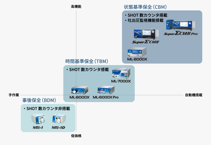 ท่ามกลางผู้จ่ายอากาศชีพจรรูปแบบบริษัทเรา ML-8000X และซีรี่ย์ SuperΣCMIV ติดตั้งฟังก์ชัน "การเฝ้าสังเกตการณ์การขับไล่ความกดดัน" ในฐานะคุณสมบัติใหม่ ด้วยเหตุนี้ทุกกิริยาท่าทางการขับไล่ เฝ้าดูได้ ว่าความกดดันที่ออกมาจากผู้จ่ายเป็นตามการติดตั้ง ไม่เพียงแต่วิธีใช้ที่รู้เกี่ยวกับจังหวะเหมาะที่มีความผิดปกติในการขับไล่ด้วยเสียงปลุกเท่านั้น ประกอบความถี่ของเสียงปลุกนั้นและสภาพการเกิดไม่ดีในสถานที่ปฏิบัติงานของลูกค้า และใช้จังหวะเหมาะของการบำรุงรักษาให้เหมาะสมที่สุด เพราะวิเคราะห์ความเกี่ยวพันกัน และลดค่าใช้จ่ายสูญเปล่าได้ลง